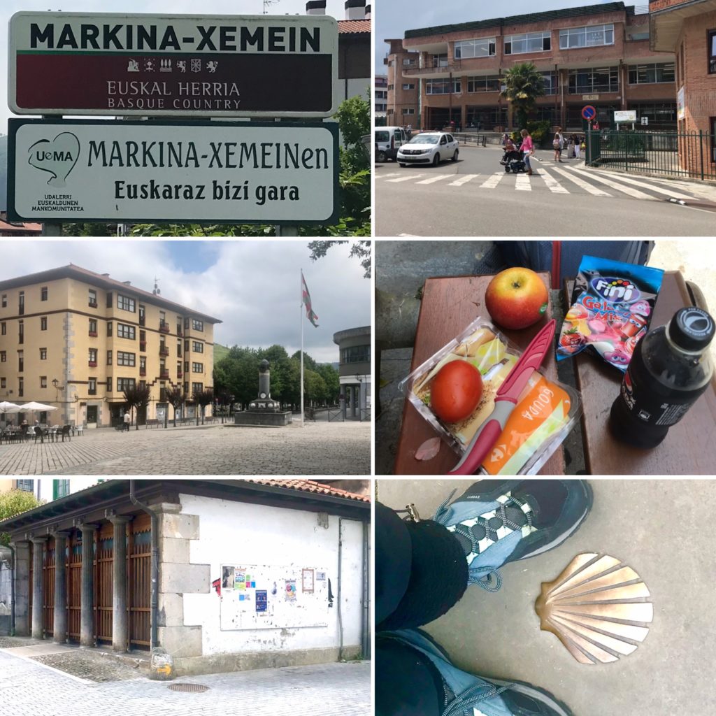 Das nächste Ziel war Markina-Xemein. Dort würde ich auch wieder auf meine Pfeile stoßen ☝🏻. Als ich die Stadt betrat, war gerade die Schule aus und ich schaute zur Uhr. Es war exakt 14:00 Uhr und ich war um 11:06 losgelaufen. Von Ondarroa bis Markina-Xemein waren es 14 km. Somit hatte ich eine recht akzeptable Zeit von 4,6 km/h hingelegt. Fräulein Ehrgeiz war für diesen Tag zufriedengestellt! Ich gönnte mir in einem kleinen Laden eine Tomate, einen Apfel, eine Zitrone, eine Cola und… Gelatine für meine beiden Muffels ☝🏻. Damit setzte ich mich auf die nächste Schattenbank (das Wetter hatte sich gehalten) und holte noch meinen Rest Käse dazu heraus. Die Zitrone kam in den Früchtebehälter meiner Flasche 😋. Gekräftigt und wieder gespornt drehte ich mich eine viertel Drehung nach rechts und erblickte den ersten gelben Pfeil! Könnt ihr ihn auf den Bildern finden 😉? Kurz darauf überraschte mich eine bronzefarbene Muschel im Boden und ich war wieder sofort motiviert 💪🏼!